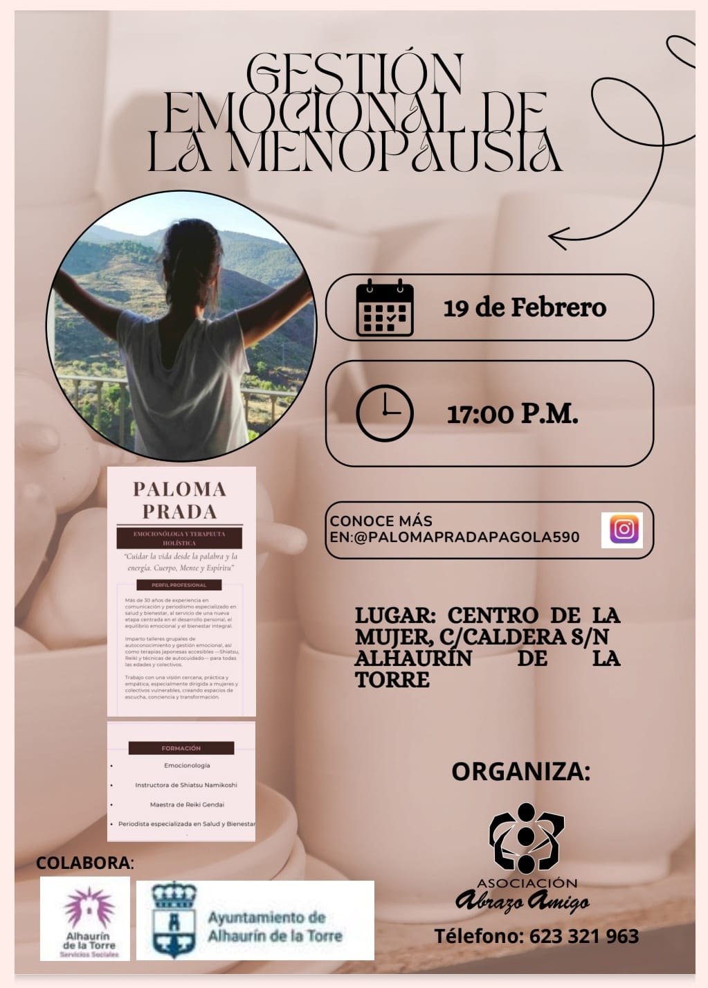 La Asociación Abrazo Amigo organiza una charla sobre la gestión emocional de la menopausia, impartida por Paloma Prada, periodista especializada en salud y bienestar, emocionóloga y emprendedora en el Vivero Municipal de Empresas.