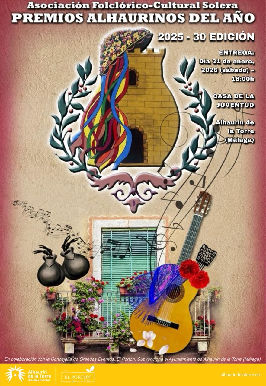 La gala de los premios Alhaurinos del Año que organiza la Asociación Folclórico-Cultural Solera de Alhaurín de la Torre cumple ya 30 ediciones. El acto, en el que colabora el Ayuntamiento a través de distintas áreas, tendrá lugar este próximo sábado, 31 de enero, en la Casa de la Juventud, a partir de las 18.00 horas, con entrada libre hasta completar aforo.