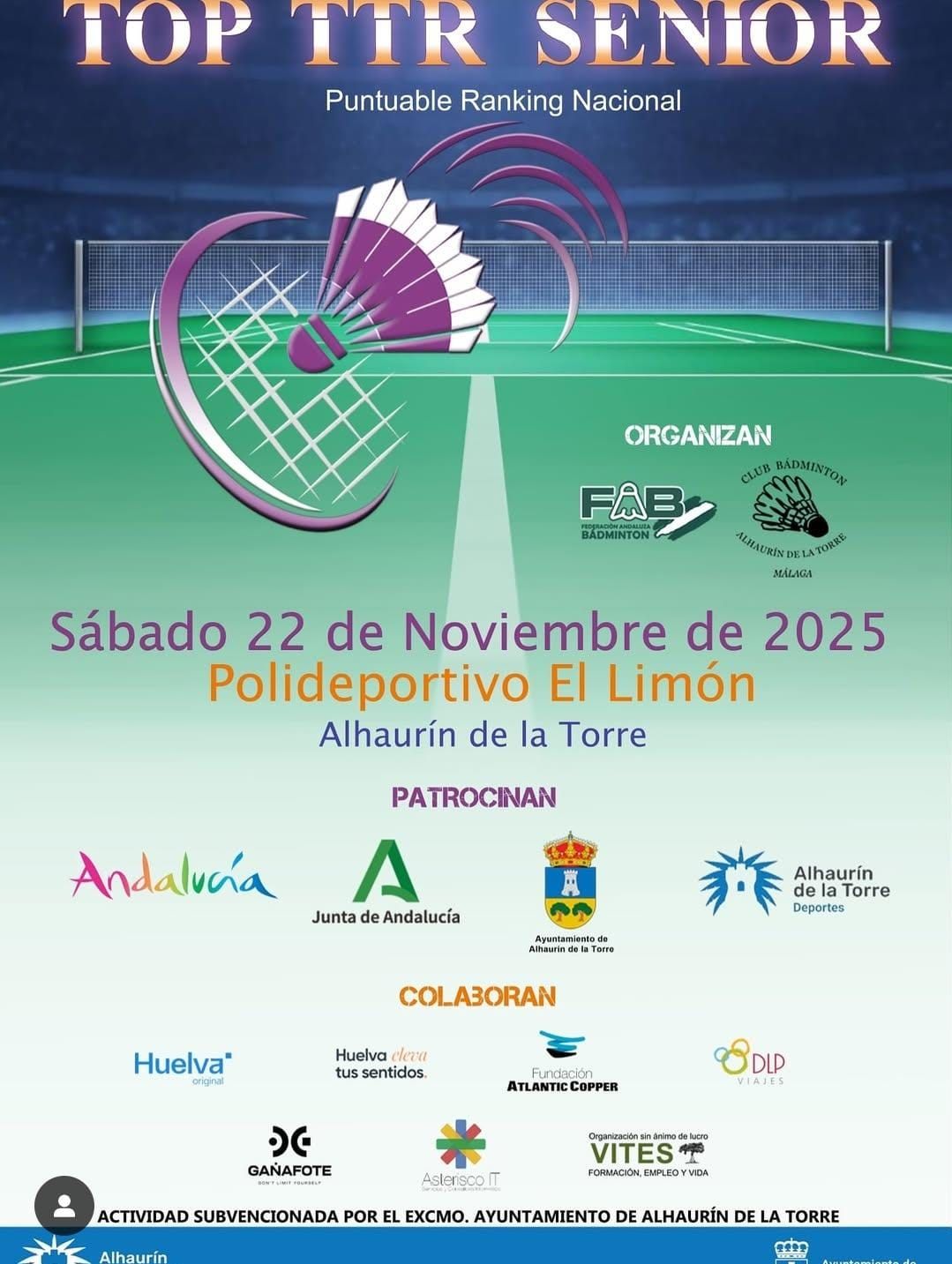 El Polideportivo El Limón acoge el próximo 22 de noviembre el Andalucía TTR Sénior de Bádminton, puntuable en el ranking nacional.