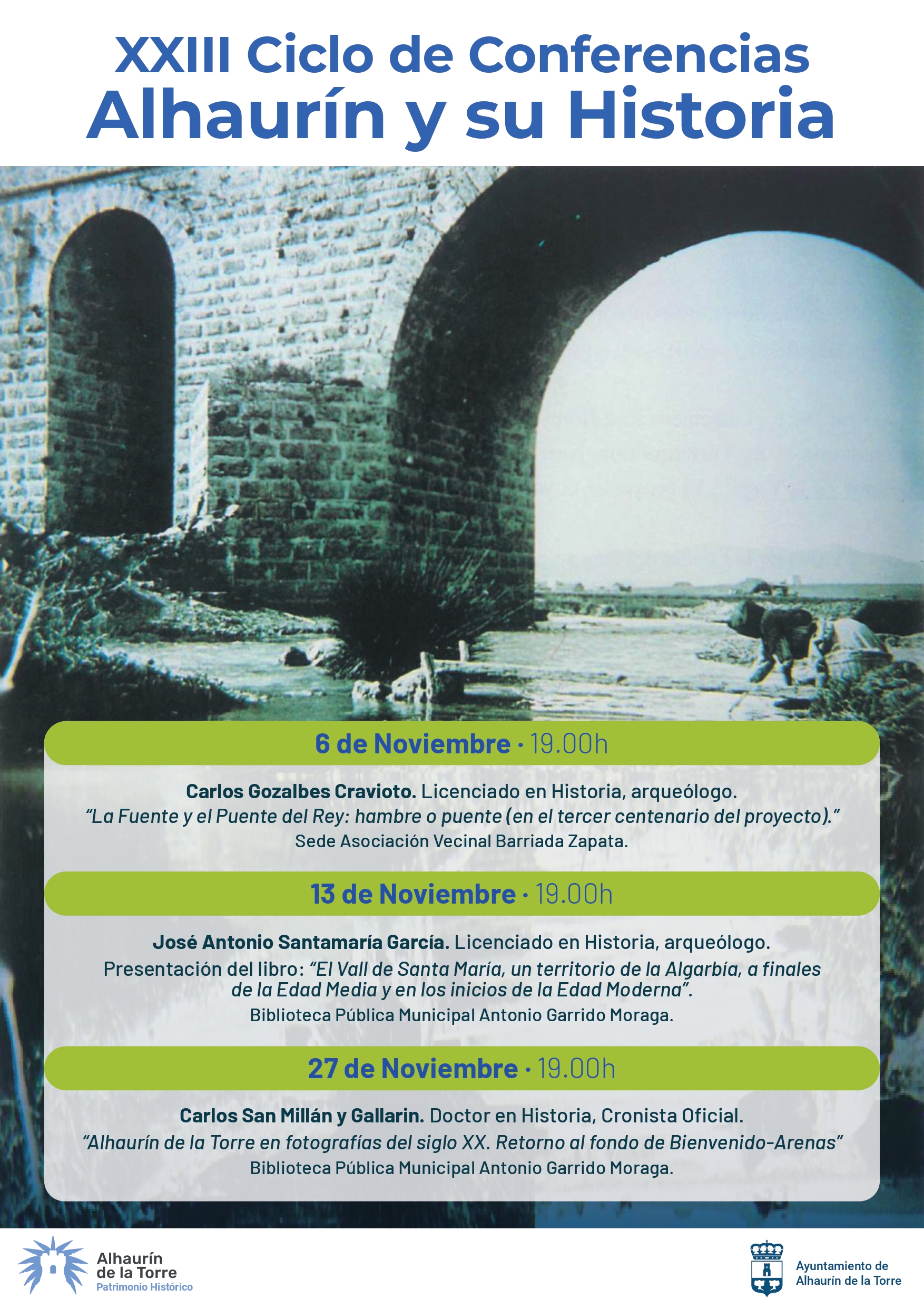El XXIII Ciclo de Conferencias ‘Alhaurín y su Historia’ suma ya 23 ediciones y nació con la finalidad de indagar en interesantes episodios del pasado local, poner en valor el patrimonio del municipio y revelar a la ciudadanía aspectos históricos, muchos de ellos todavía desconocidos para buena parte de los vecinos. En esta ocasión serán tres las citas programadas, todas ellas con entrada libre hasta completar el aforo y comenzando a las siete de la tarde.