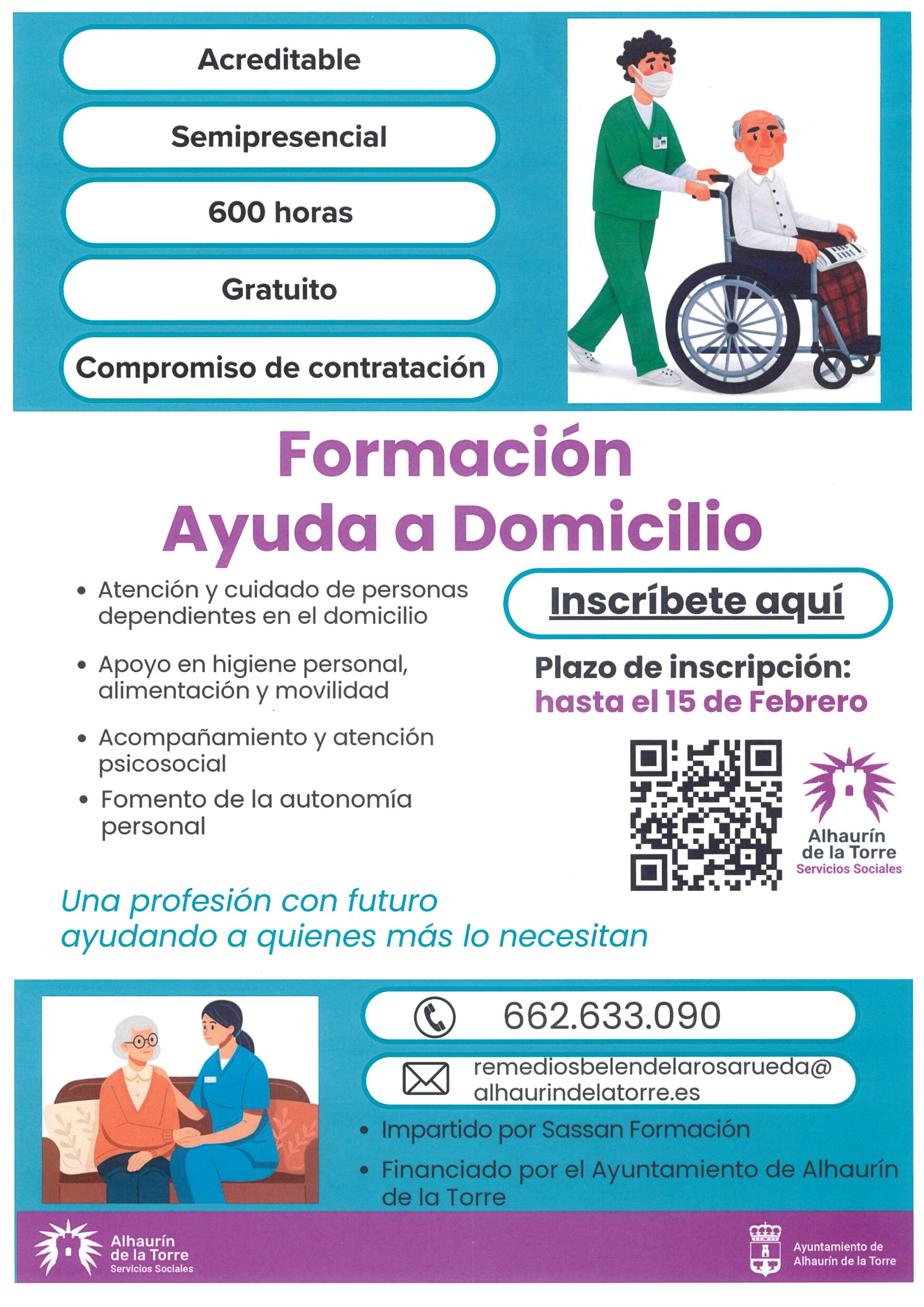 Las personas interesadas pueden obtener más información en el cartel adjunto, a través del número de teléfono 662 633 090 y por la dirección de correo electrónico remediosbelendelarosarueda@alhaurindelatorre.es. Será impartido por profesionales de la empresa Sassan Formación y financiado por los Servicios Sociales del Ayuntamiento. Para inscribirse, hacer click AQUÍ.