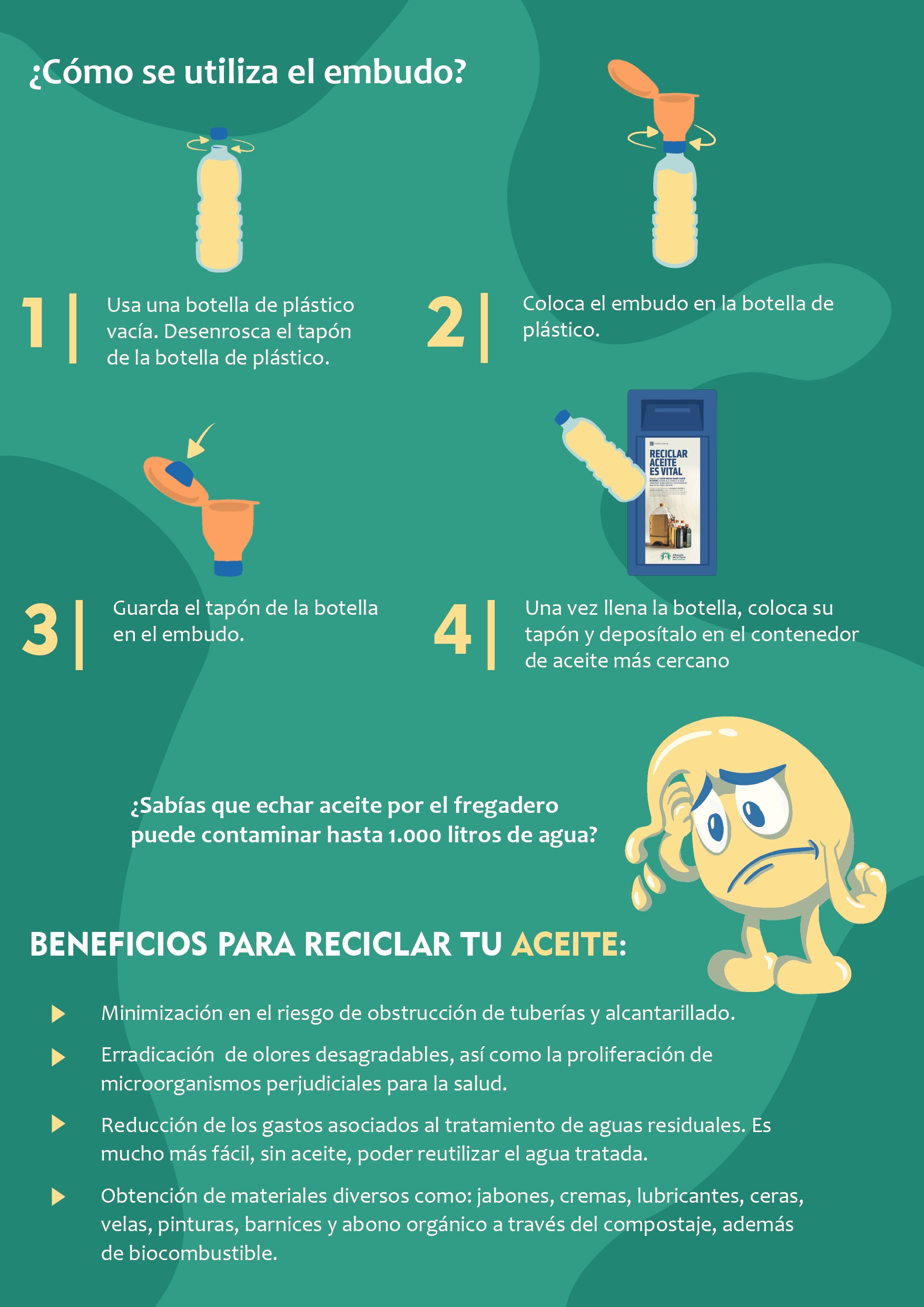 Para ello, se han repartido folletos y se han distribuido embudos universales reutilizables para colocarlos en las garrafas o botellas de plástico que se pueden usar para la recogida del aceite de ollas, sartenes o freidoras, y su posterior depósito en el contenedor correspondiente.