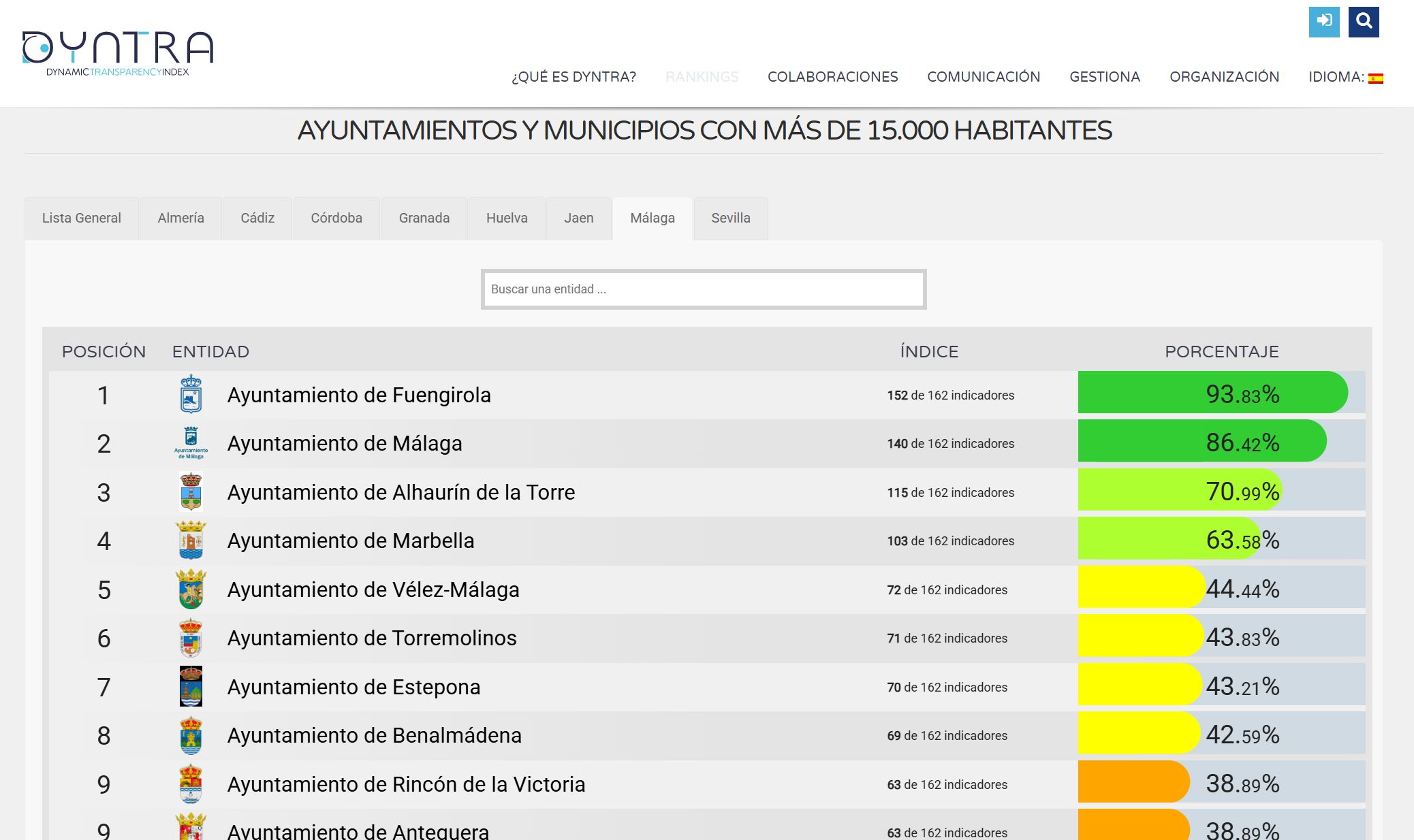 El Ayuntamiento de Alhaurín de la Torre ha logrado un muy importante avance en materia de transparencia institucional y gobierno abierto, al escalar del 37% al 70,99% en el cumplimiento de indicadores evaluados por la plataforma colaborativa Dyntra, tras haberse implantado una nueva plataforma web. Gracias a este notable progreso, la localidad se sitúa como el tercer municipio con mayor nivel de transparencia de la provincia de Málaga (antes ocupaba la posición 12), ascendiendo además del puesto 50 al 10 en Andalucía y del 250 al 61 a nivel nacional. Esta clasificación provincial la lidera Fuengirola -que roza el 94% de cumplimiento-, seguida de la capital malagueña -con el 86,4%-, mientras que por debajo de nuestro municipio se encuentran municipios con mucha mayor población, como Marbella, Vélez-Málaga, Torremolinos, Estepona, Benalmádena y Rincón de la Victoria.