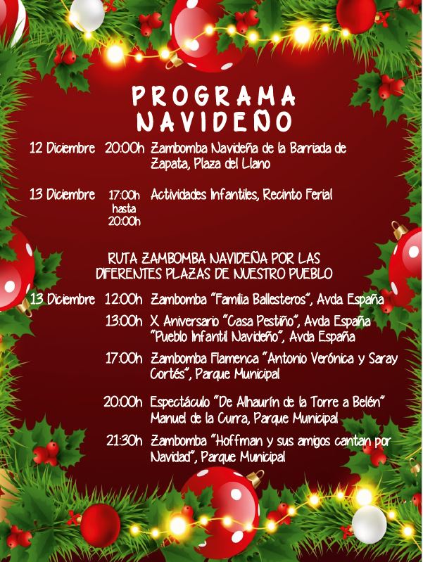 La gran jornada de Ruta de Zambombas se ha fijado para el sábado, 13 de diciembre con dos escenarios distintos. Por la mañana, desde las 12, en la Plaza de San Sebastián, donde actuarán la Zambomba de la Familia Ballesteros (12 horas) y Casa Pestiño (13 horas). Por la tarde la cita se traslada al Parque Municipal con Zambomba Flamenca de Antonio de Verónica y Saray Cortés (17 horas), De Alhaurín de la Torre a Belén con Manuel de la Curra (20 horas) y Hoffman y sus amigos cantan por Navidad (21:30 horas).