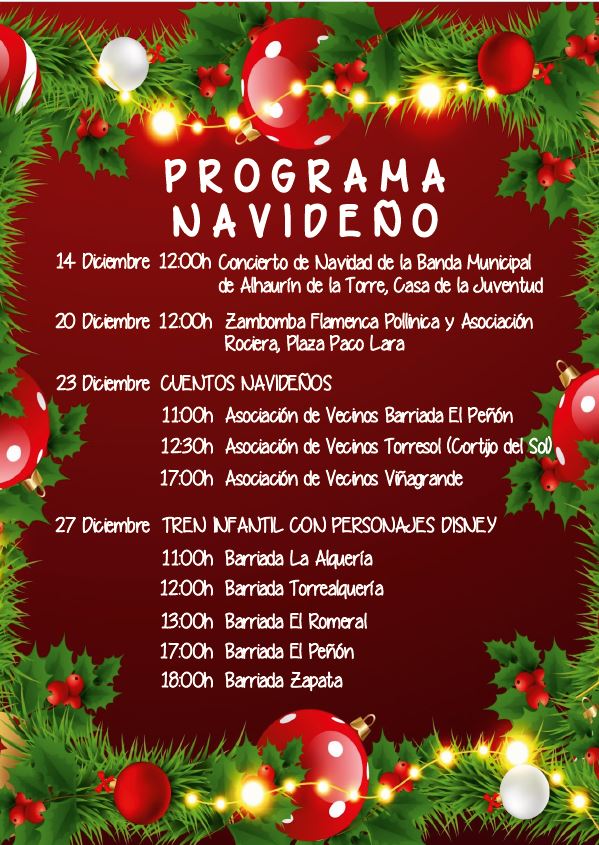 Ya el martes, 23 de diciembre, llegan los cuentacuentos navideños a algunas barriadas como El Peñón (11 horas), Torresol (12:30 horas) y Viñagrande (17 horas). El viernes 27 será la jornada en la que el tren navideño con personajes de animación infantiles visite La Alquería (11 horas), Torrealquería (12 horas) y El Romeral (13 horas) y en horario de tarde El Peñón (17 horas) y Zapata (18 horas).