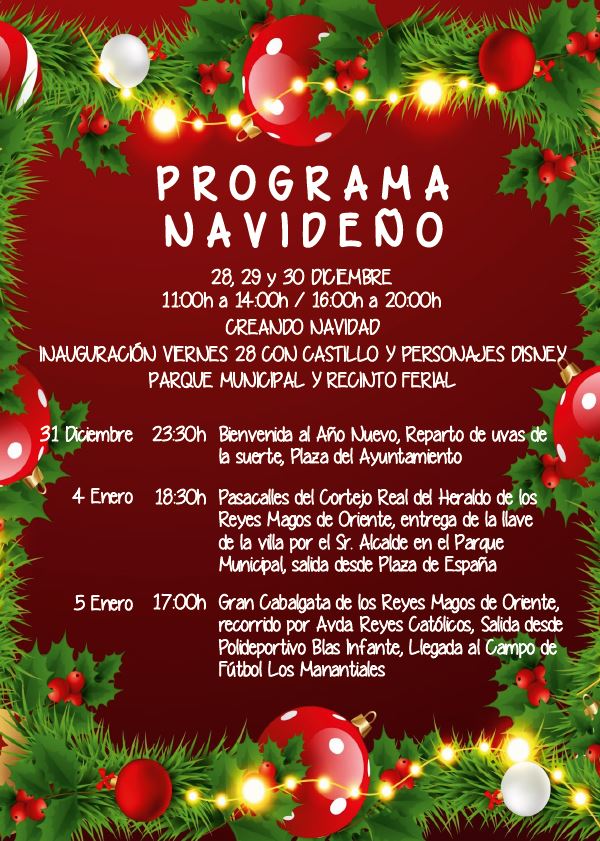 El encendido del alumbrado será el viernes, 5 de diciembre; la Ruta de Zambombas el día 13 y el ‘Creando Navidad’ del Parque Municipal los días 28, 29 y 30. Habrá también cuentacuentos y mucha animación para los más pequeños. La Cabalgata de Reyes repetirá recorrido por la travesía urbana
